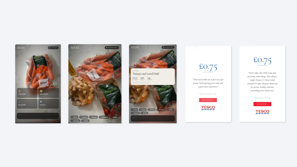 Mise is a voice-first, vision-enabled kitchen companion that sees what ingredients you have, suggests what to cook, and closes the loop to a shopping basket, all using natural conversation.